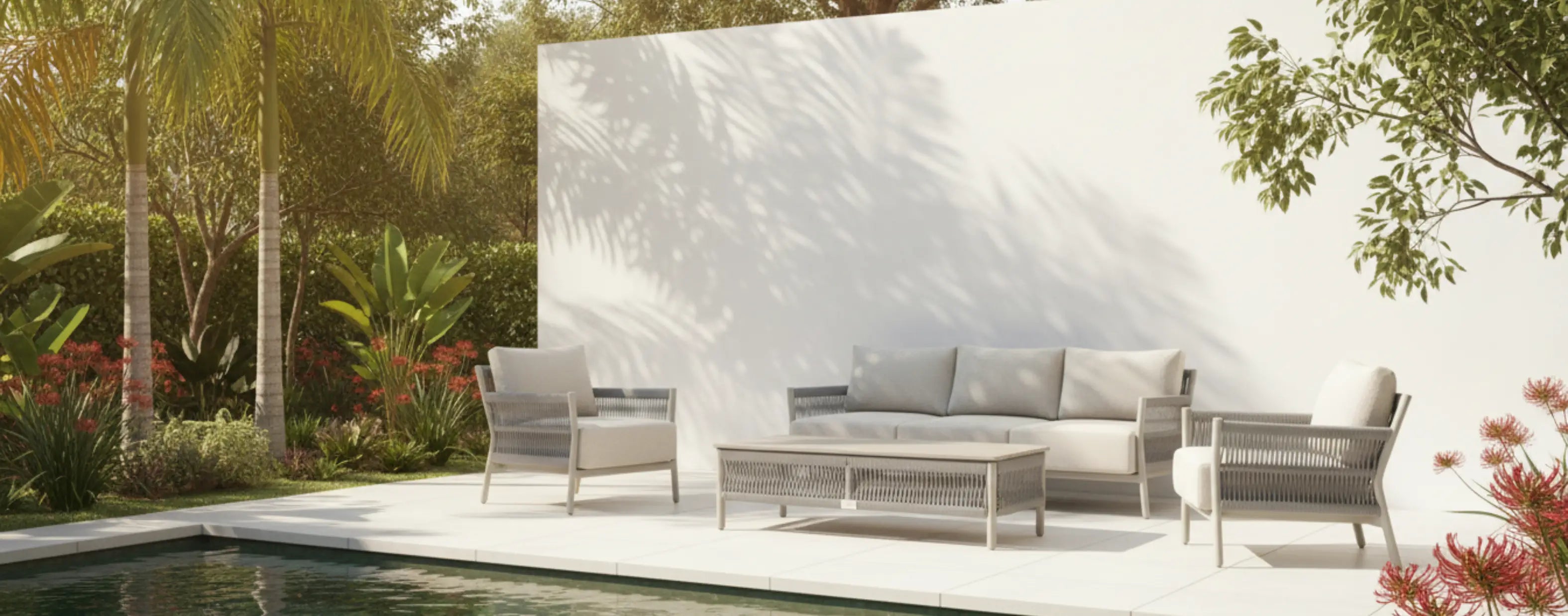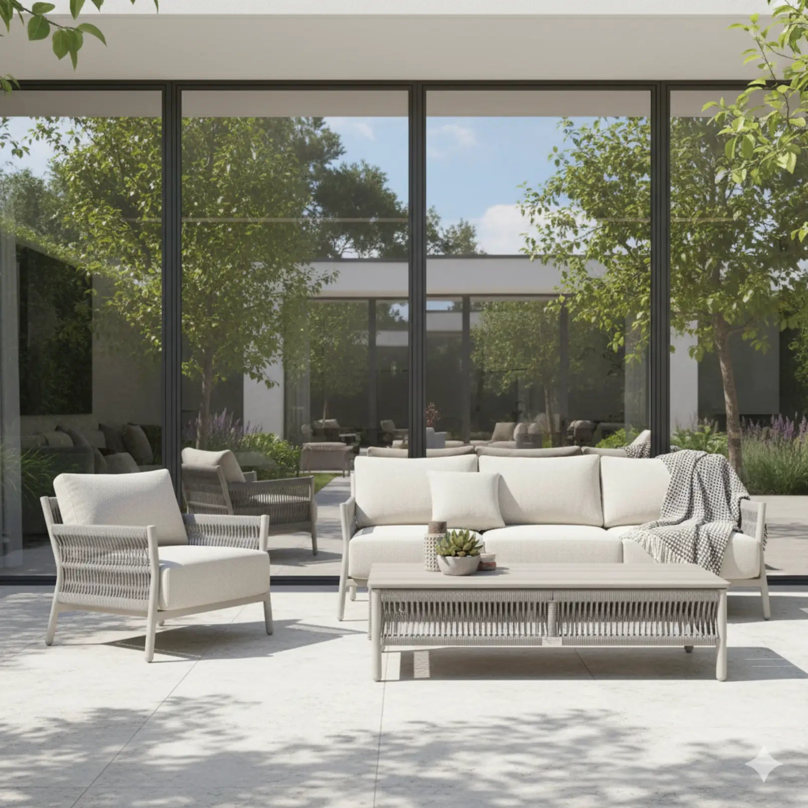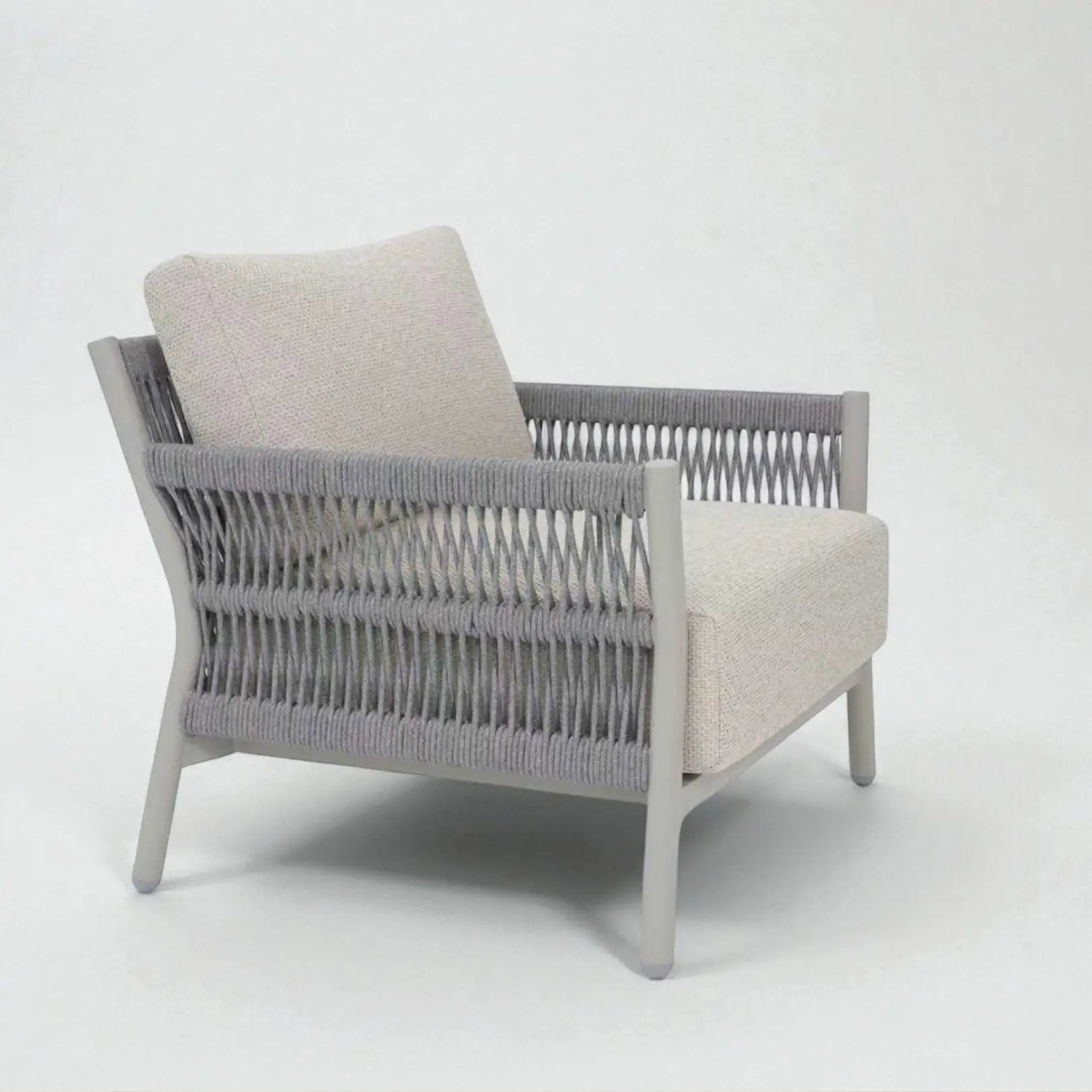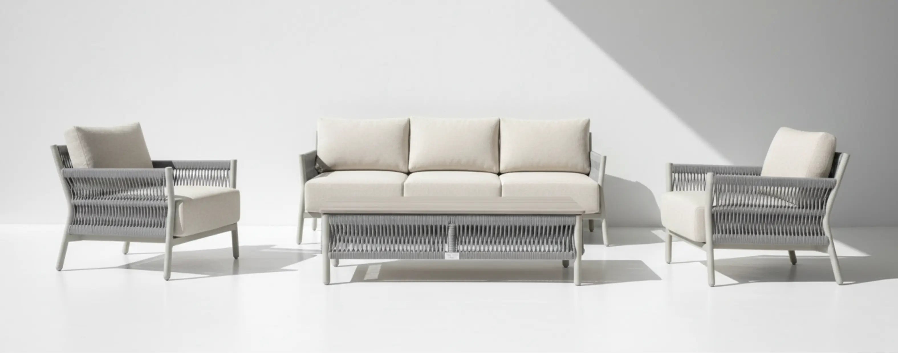 A serene fusion of contemporary lines and artisanal rope craftsmanship, the Mykonos Outdoor Set brings a refined Mediterranean character to modern outdoor living. Defined by its soft contours, tailored cushions, and quietly confident silhouette, it creates an atmosphere of relaxed elegance in any open air setting.