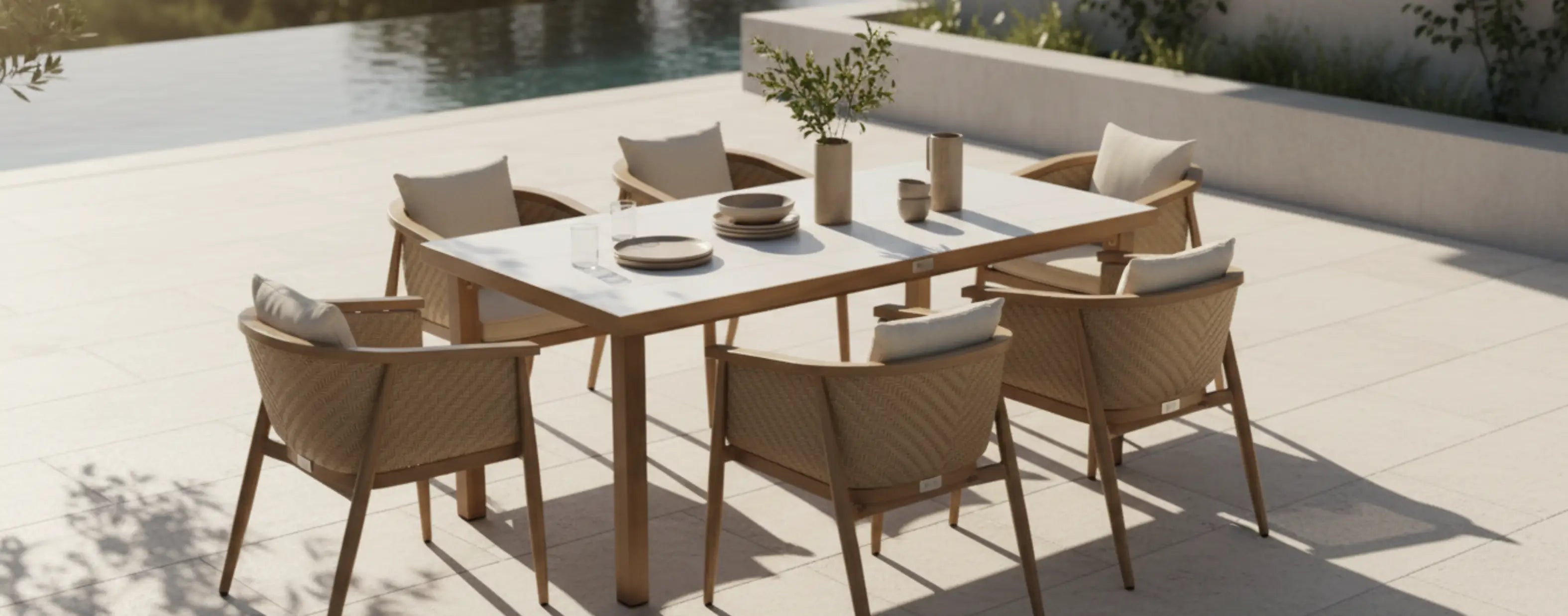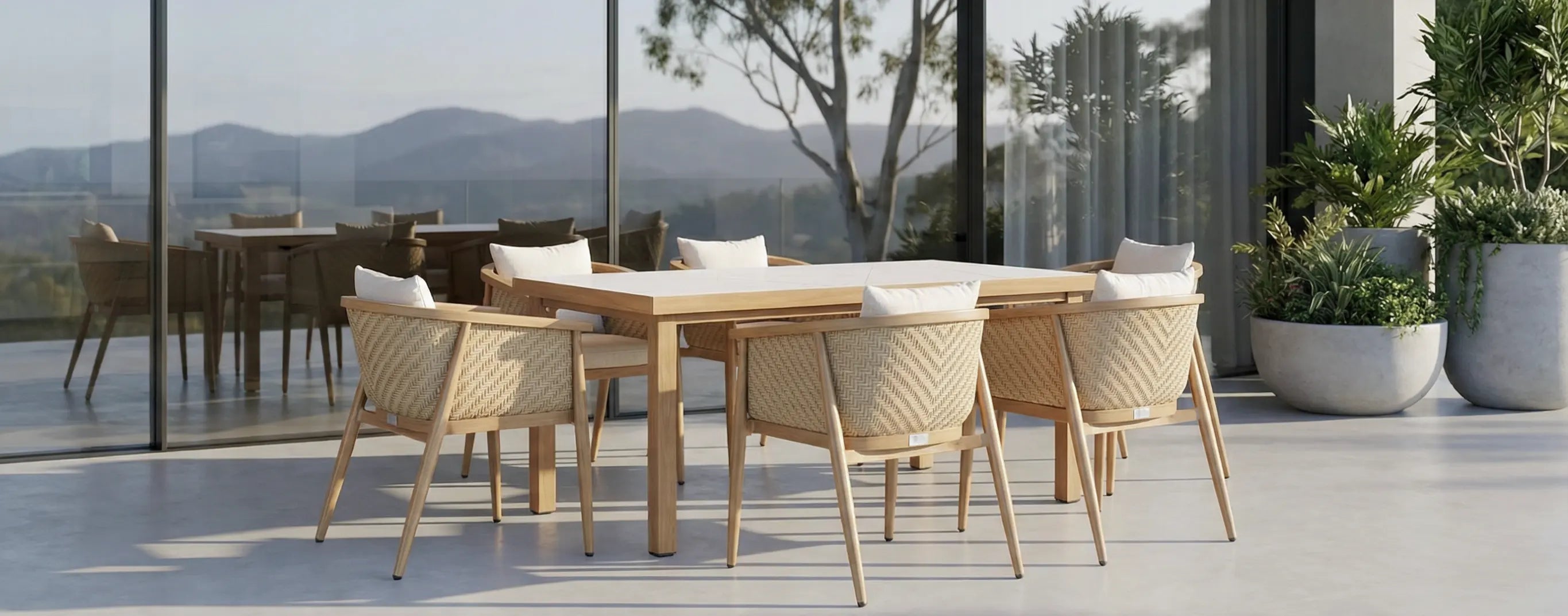 A warm modern dining collection shaped by a teak inspired frame, rattan style textures, and soft tailored cushioning. The New York Outdoor Dining Set creates an atmosphere of relaxed sophistication, transforming open air meals into memorable, elevated moments