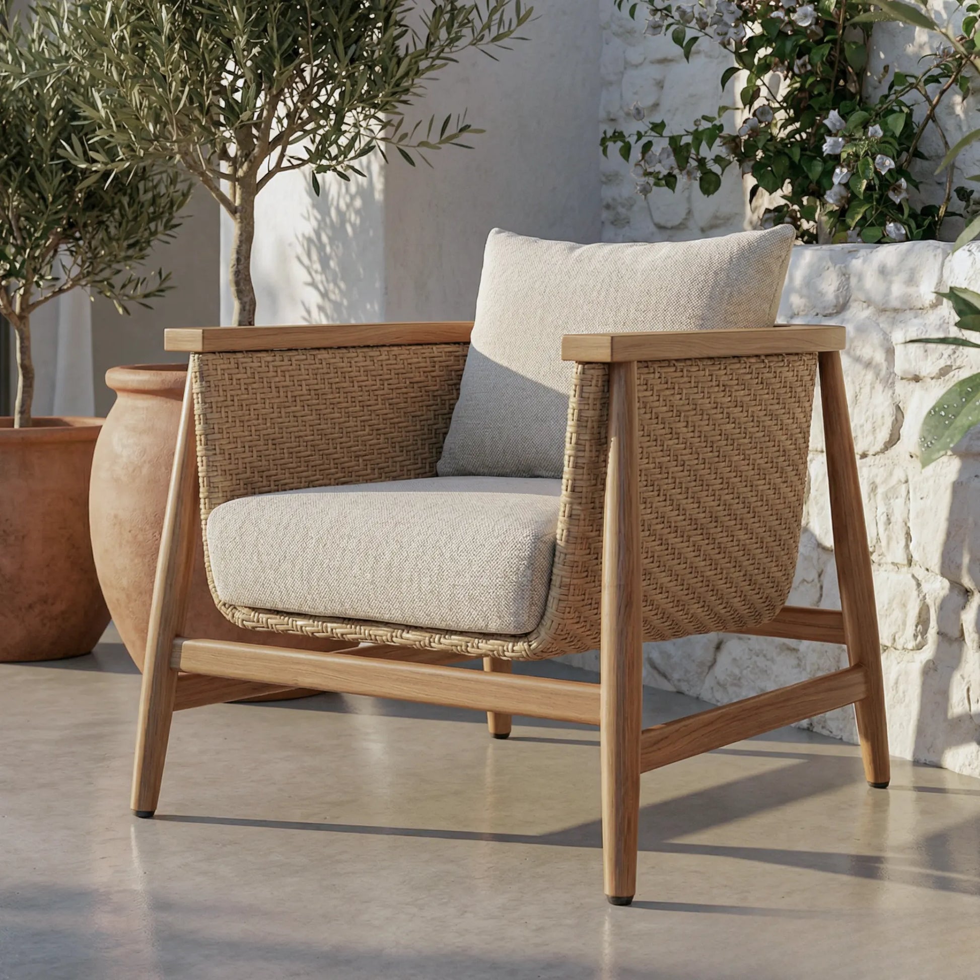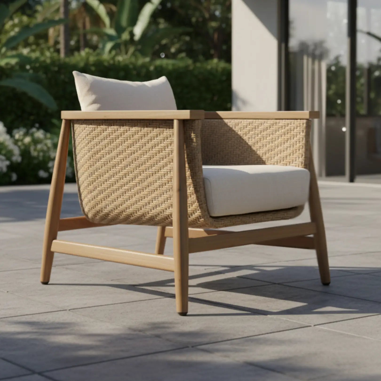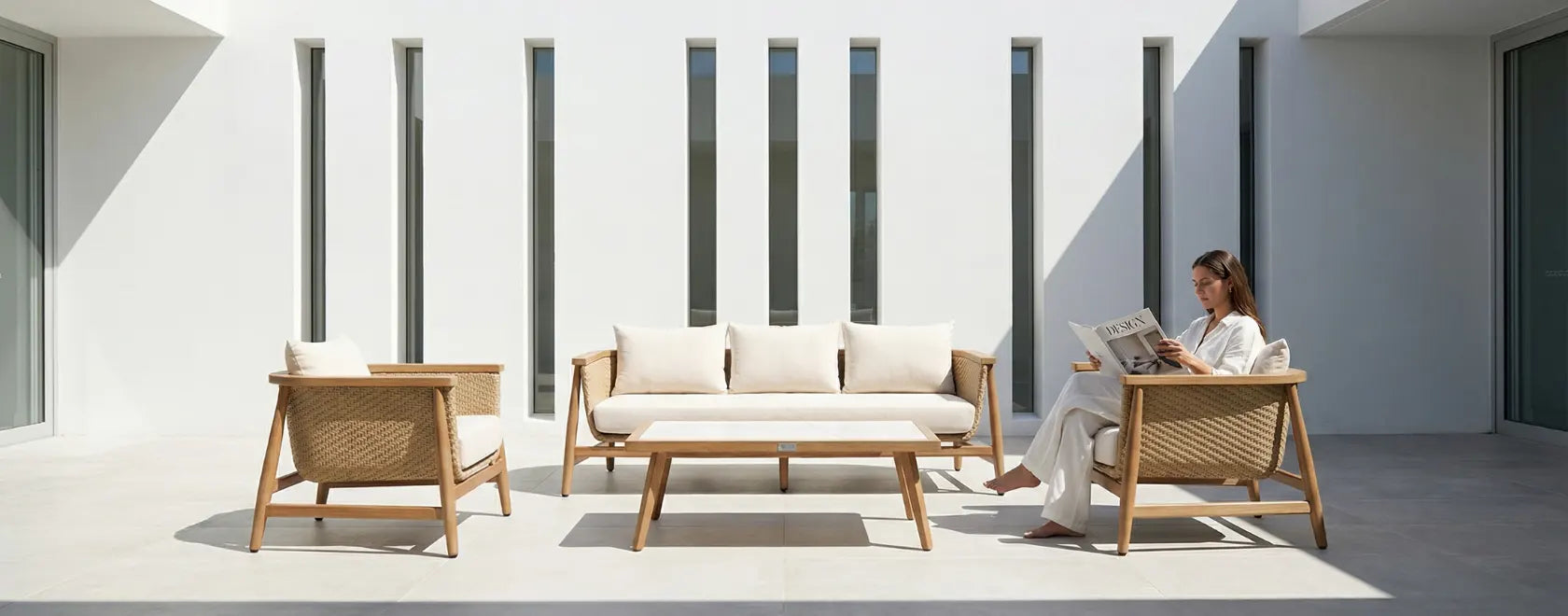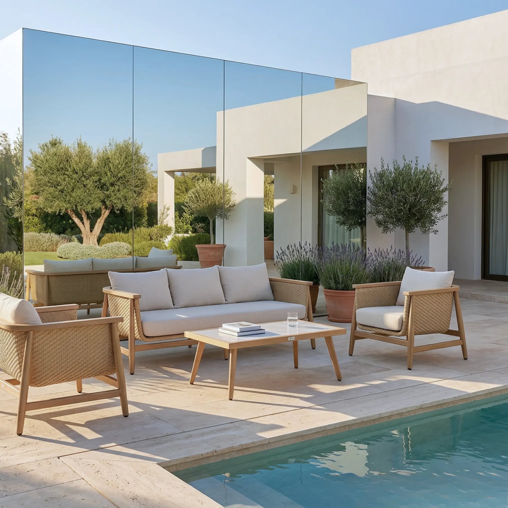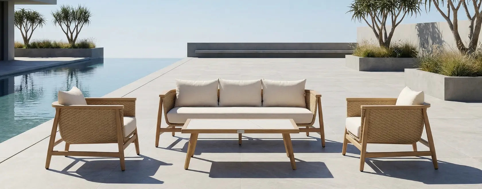 A warm modern interpretation of outdoor living, the New York Outdoor Set blends teak inspired structure with woven rattan textures and soft tailored cushions. Its clean lines and natural palette create an atmosphere of contemporary ease, bringing understated sophistication to terraces, gardens, and open air lounges.