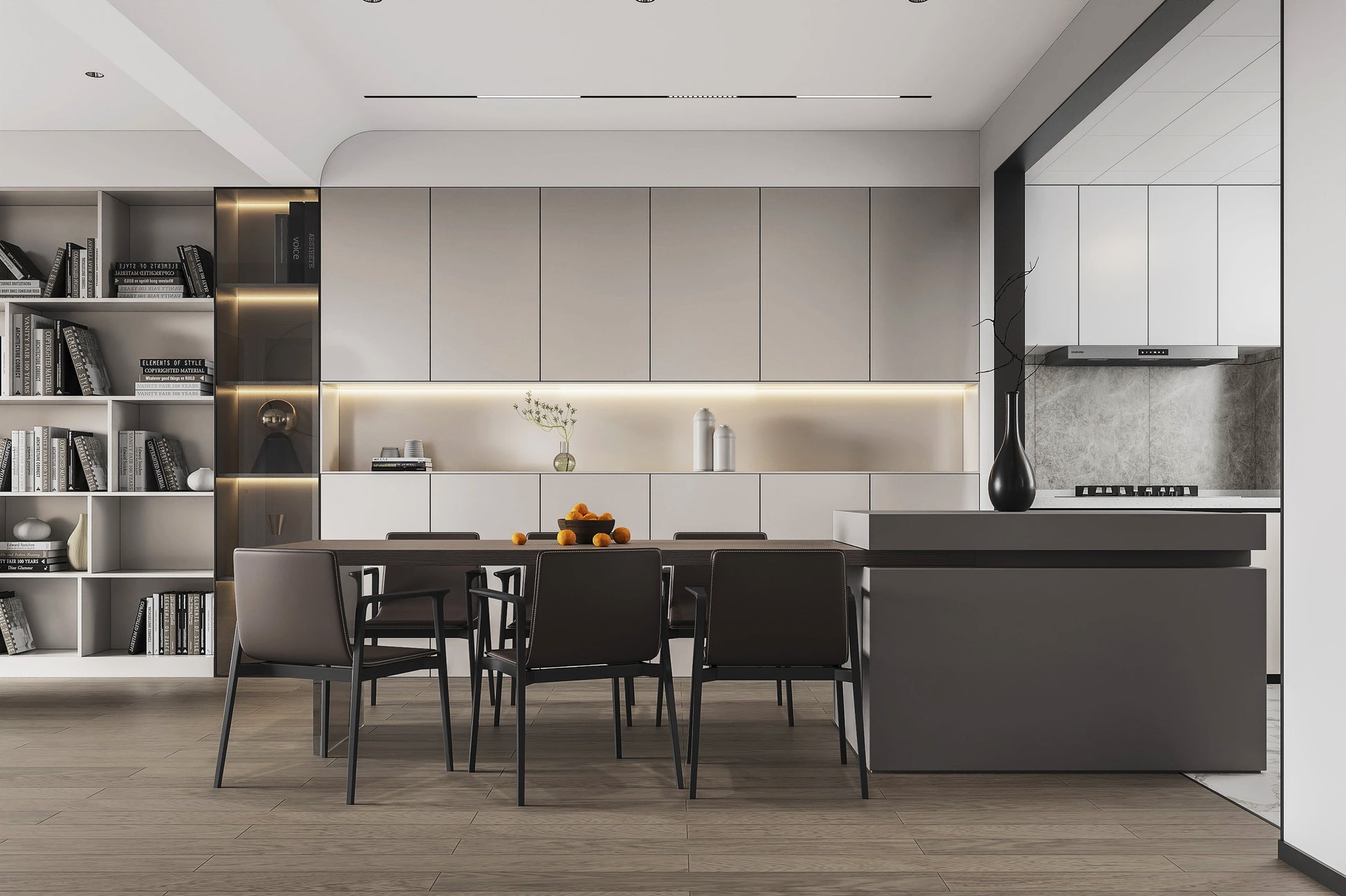 Reykjavik stretches across the room with soft greige cabinetry, a shelving tower and restrained linear
